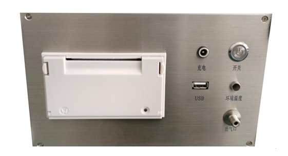 背面由充電口、開關(guān)鍵、USB接口、環(huán)境溫度、出氣口、微型針式打印機(jī)組成。